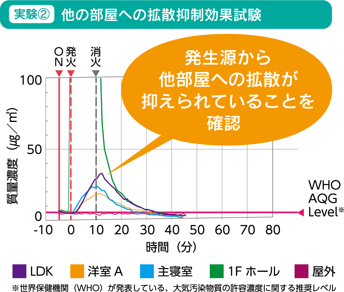 こちらのグラフは横軸が“時間”、縦軸が“質量濃度”といって大気汚染物質の濃度を表す指標で、ピンクの横線はWHOが発表している大気汚染濃度の推奨レベルとなっています。線香をたくと、一時的に濃度は上がりますが、約40分で元の空気環境に戻りましたので、粉塵がしっかり除去されている事が分かります。