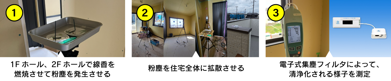 MAXairの性能を実証するために、実機を使い、線香を粉塵に見立てて、家全体に拡散した粉塵がどのように除去されるのか計測しました。