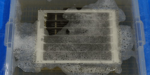 フィルタが入る桶に水を張り、ご家庭で使用している台所用中性洗剤を30分程置くだけ。