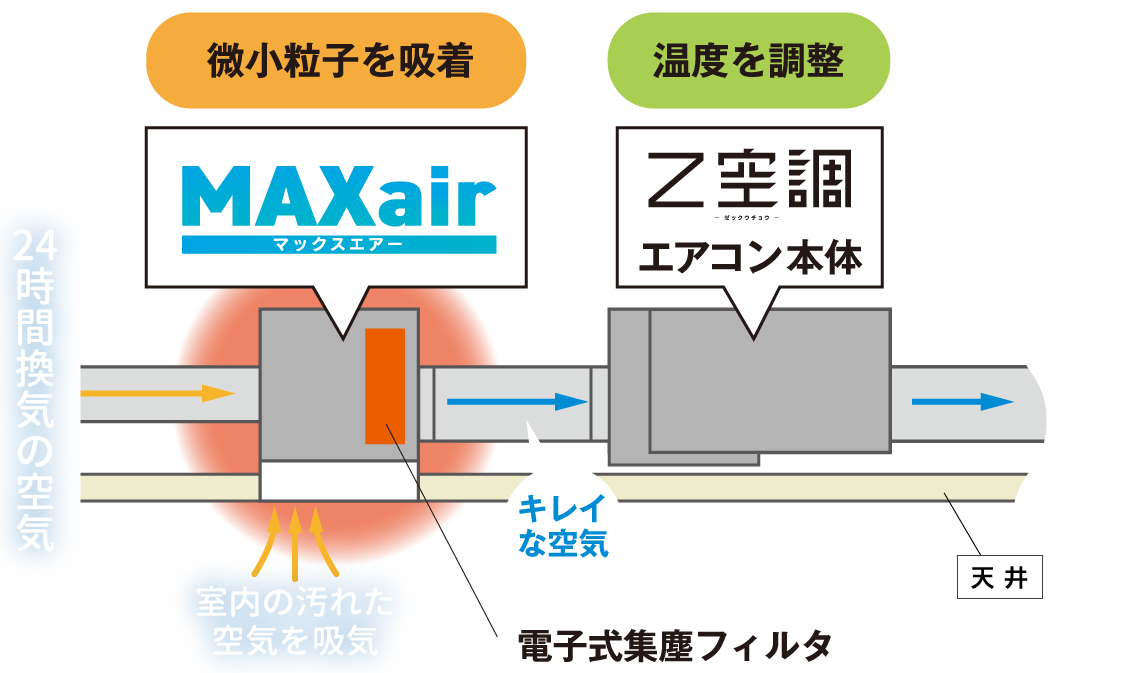 全館空調システムの空気循環経路に電子式集塵フィルタ「MAXair」を組込み、空調された空気を微小粒子まで清浄化、家全体にムラなく行き渡らせることができます。空気循環のたびに空気清浄されるので、局所的な空気清浄機とは異なり、家全体の空気清浄度が高まります。
